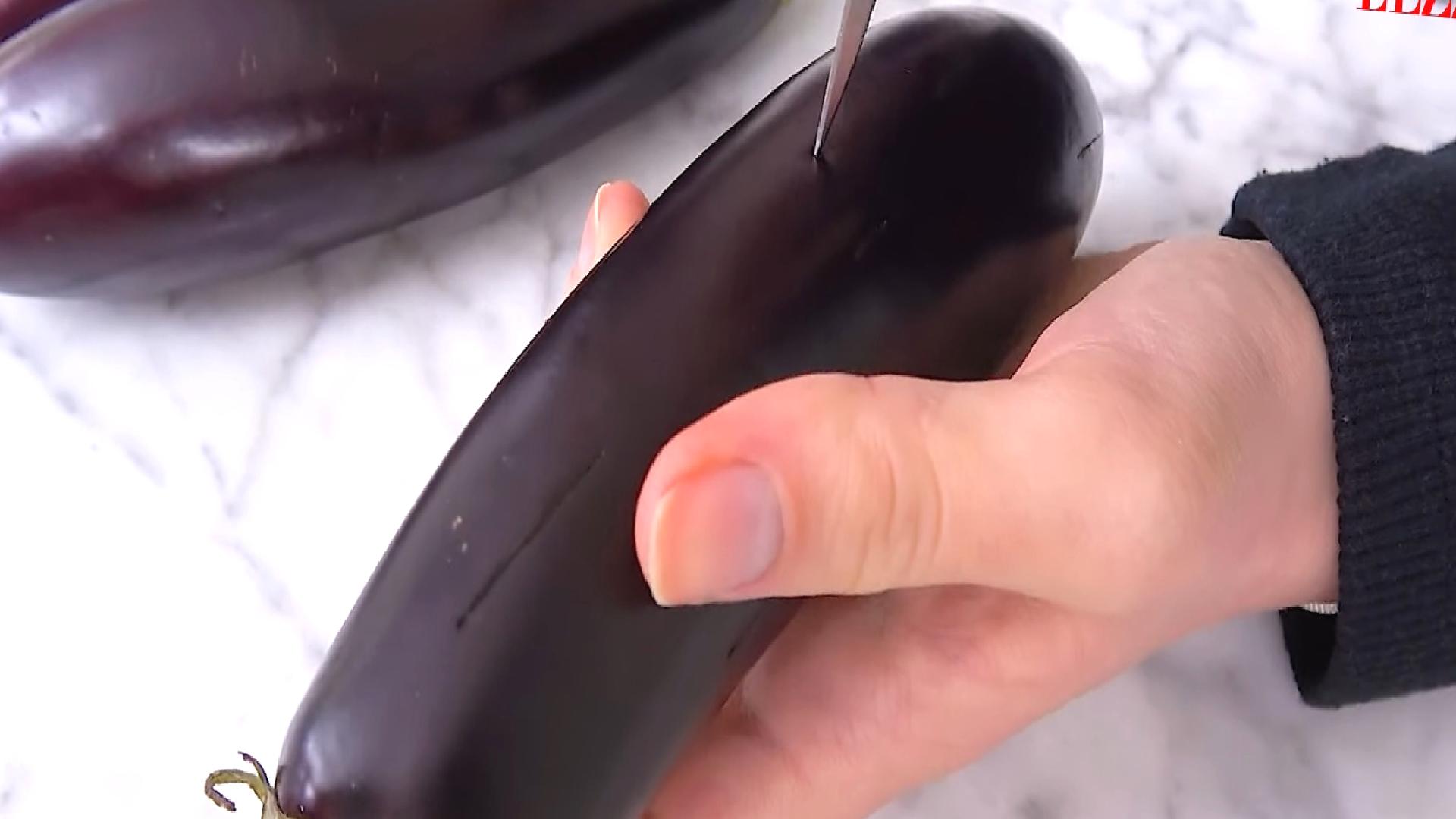 • Öncelikle patlıcanların dışını yıkayın ve kurulayın. Ardından bıçak yardımıyla üzerine ince çizikler atın.
