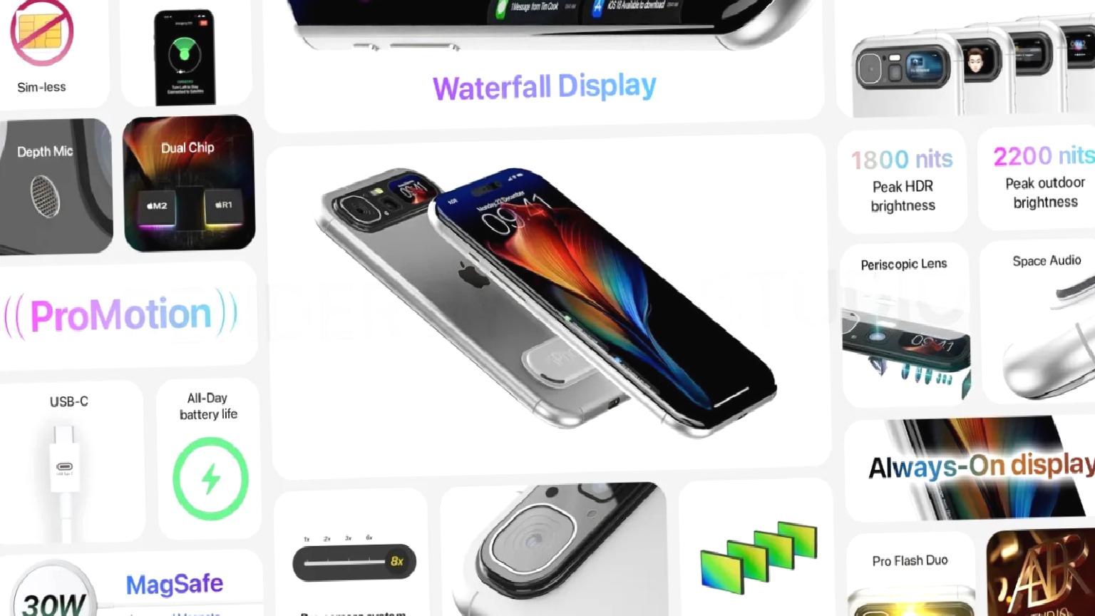 iPhone Vision, Apple’ın birkaç hafta önce tanıttığı Vision Pro’dan esinleniyor. Daha heyecan verici olan ise birincil ve ultra geniş açılı lenslerin yerini alan gerideki Liquid Lens kamera. Konseptte daha iyi yakınlaştırma için ikincil bir periskop lens bulunuyor. Bu ortada iPhone 15 Pro Max, iPhone’un ilk periskop lensini sunacak.