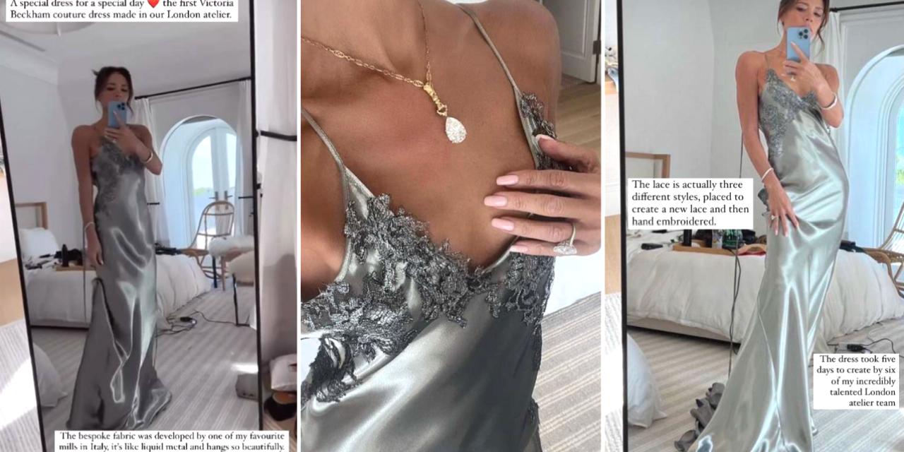 Victoria Beckham’ın en büyük oğlunun düğününde giymeyi seçtiği kıyafet, modada anlayan çabucak hemen herkesten övgü alıyor. Dantelle süslenmiş sıvı metal gümüş slip elbise modülü, kendi markasıyla kendi bünyesindeki dizayncılar tarafından onun için özel olarak yaratıldı. Beckham, Instagram öykülerinde elbisenin nasıl bir araya geldiği ve onu yapmak için harcanan gayret hakkında ayrıntılı bilgi verdi.