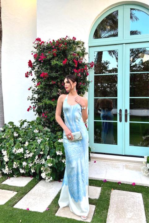 Model Nadia Ferreira, damla küpelerle süslediği mavi bir Victoria Beckham slip elbise giydi.