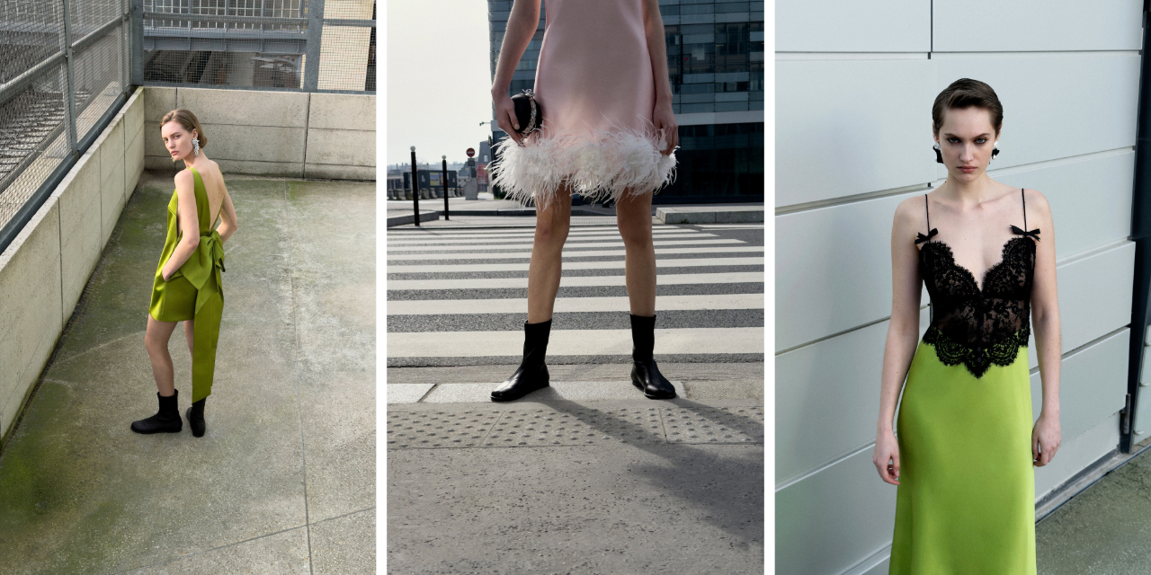 Danteller, tüyler ve fiyonklar koleksiyonun feminenliğinin kaynağını oluşturuyor. Satenlerle birleşen dev kurdeleler, canlı tonlarla dans eden siyah danteller, elbise ve etek uçlarında “chéf kiss” oluşturan tüyler koleksiyonu feminenleştirmenin yanında dinamik ve eğlenceli bir nüans da oluşturuyor.