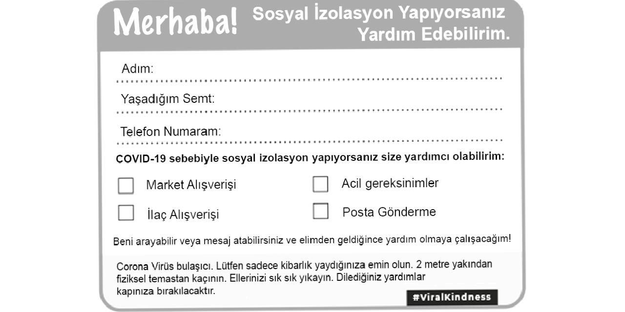 İngiltere’de bazı yardım kurumları sosyal medyada #viralkindness kampanyası başlattılar. Bunu Facebook’tan başlatan Becky Wass, evlere “Merhaba! Eğer sosyal izolasyon yapıyorsanız, size yardımcı olabilirim,” kartları yolluyor. Gönüllüler bu kartları evlerinde basabiliyor. Her kartın üstünde komşuların; isimlerini, adreslerini, telefon numaralarını, nasıl yardım edilmesini istediklerini yazabilecekleri yerler var. Biz de bu karttan ilham alarak Türkçe versiyonunu yarattık. Kişisel izolasyondayken, daha çok riskte olan insanlara yardım etmeniz mümkün.