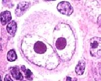 Resim 5: Hodgkin lenfomalı hastanın çıkarılan lenf bezinin mikroskop altında incelenmesinde görülen ve “baykuş gözü” şeklinde tarif edilen “Reed-Stenberg hücresi”