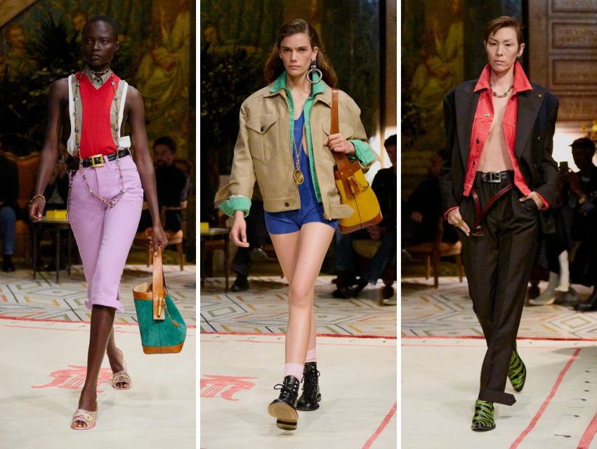Koleksiyonda rahatlıkla çekicilik bir aradaydı. Tişörtler yırtık gibi görünüyor, pantolonların düğmeleri kasıtlı olarak açık bırakılmıştı. Kemerler gevşek, elbiseler bol ama iddialıydı. Parlak renkler, mor, sarı, yeşil, kırmızı, hızla geçiyordu. Her şey biraz dağınıktı ama bilinçli bir şekilde. Bu kaotik enerji, 80’lerin gece hayatına bir selam niteliğindeydi.