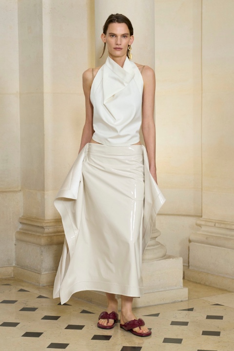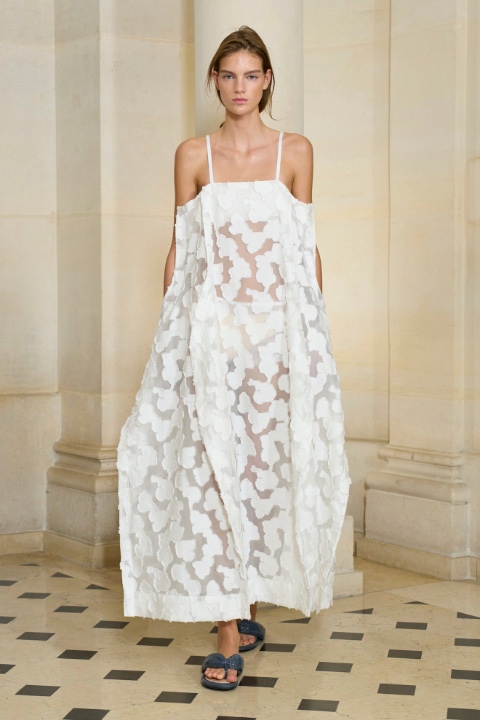 Koleksiyonun merkezinde iç giyime ve ev eşyalarına yapılan zarif göndermeler vardı: grafik katlamalı elbiseler, dantel kenarlı gömlekler, varla yok arası baskılar… Siluetler sade, dokunuşlar ise detaycıydı. Thomas’ın bu koleksiyonu bir yandan markanın arşivine saygı duruşu niteliği taşıyor, diğer yandan daha kişisel bir görsel dünya kuruyordu. Özellikle beyaz orkideye yapılan göndermeler (Madame Carven’in 1993’te bir botanikçiyle geliştirdiği tür) bazı siluetlerde zarif bir soyutlamayla yeniden hayat buldu.