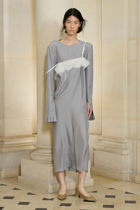 Bu koleksiyonda Thomas’ın Paris’e özgü bir “déshabillé”, yani hafif bir biçimde giyinik olma hali arayışı dikkat çekiciydi. Önceki sezonlara göre vücuda daha yakın duran kesimler, hacimli ama akışkan kumaşlar ve silik desenler hem yazı çağrıştırıyor hem de şehir yaşamına ayak uyduruyordu. Defilenin soundtrack’i, NTS Radio sunucusu Macca’nın seçtiği kadın müzisyenlerin parçalarından oluşuyordu ve bir kadının gün içindeki ruh haline kulak vermeye davet ediyordu.