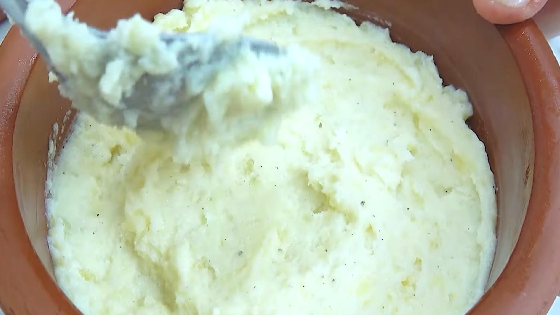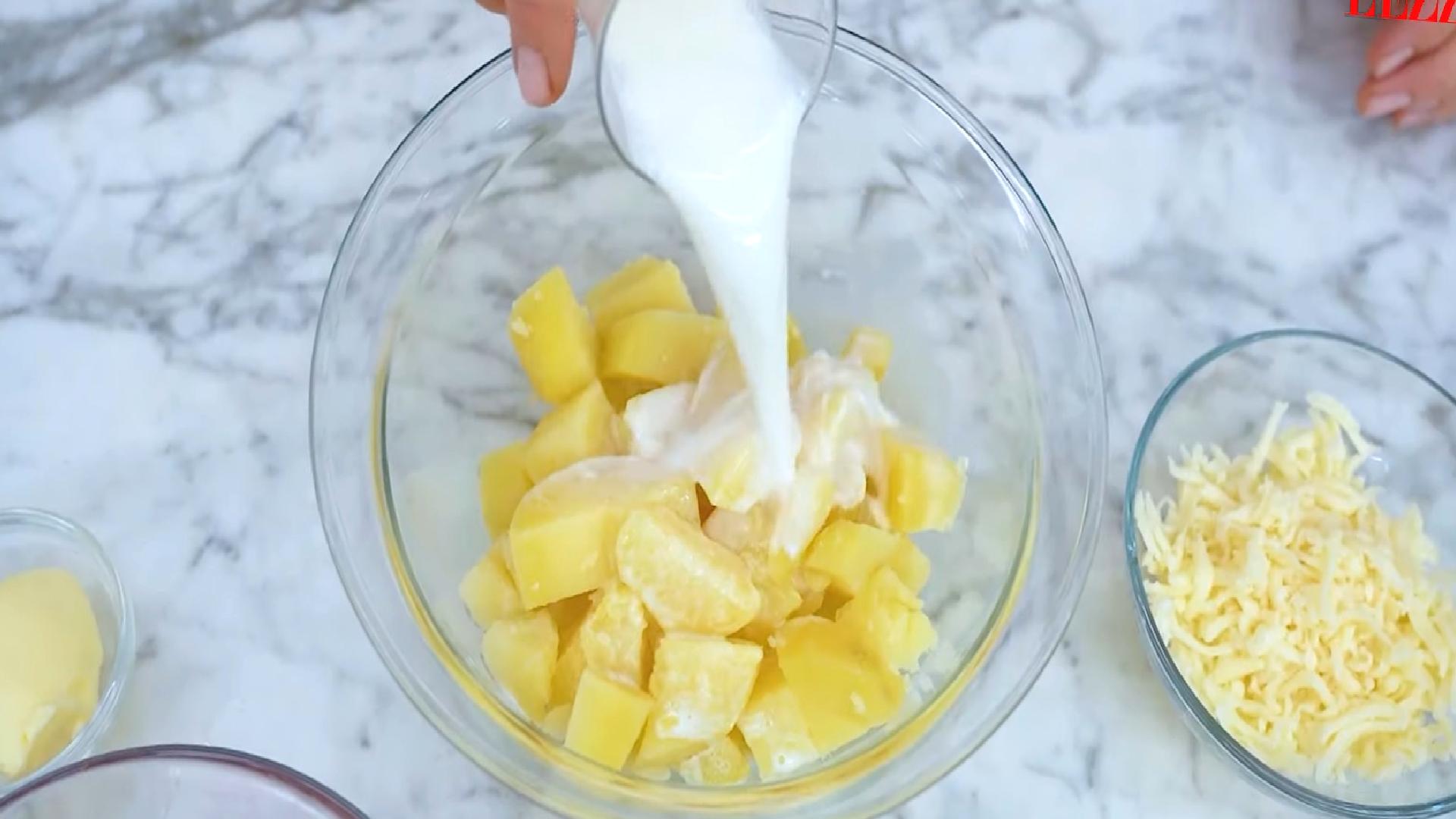 - Haşlanmış patatesin üzerine süt, rendelenmiş kaşar peyniri, tuz ve karabiber ekleyerek bir ezici yardımıyla ezin.