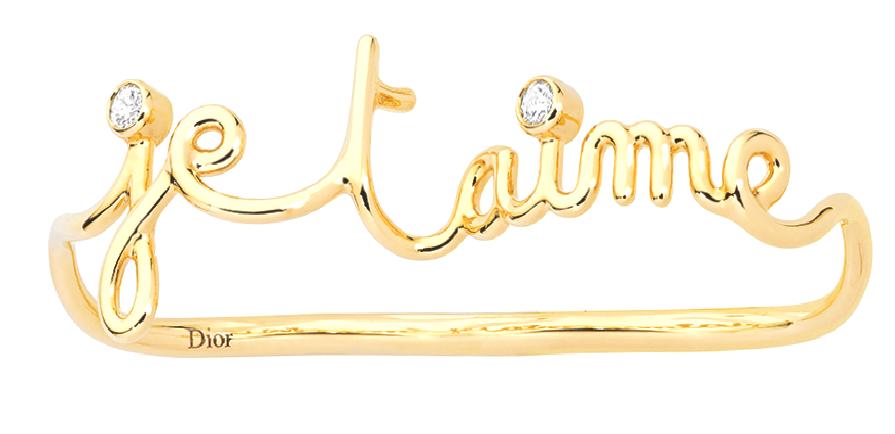 Dior Sevgililer Günü seçkisi arasında özel Dioramour çantalarının yanı sıra, Dior Joaillerie mücevher koleksiyonunu sunuyor. Her dilde aşkınızı ilan etmek için bu Fransızca 'Je Taime' yani 'Seni Seviyorum' yazılı bilekliği tercih edebilirsiniz.