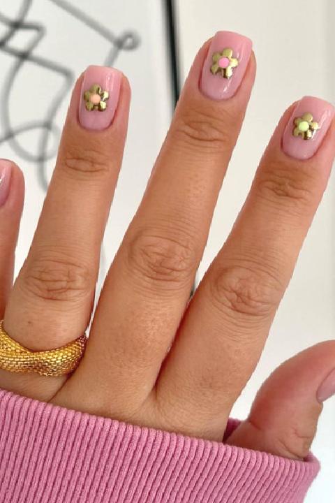 Çiçek desenlerin altın süslemeli kombinasyonu, modaya olan sevginizi göstermenin kusursuz bir yoludur. Her çiçeğin ortasına küçük altın noktalar ekleyin. Daha fazla süsleme istiyorsanız, aynı metalik noktaları tırnak tabanının üstüne nazikçe uygulayın. İster bir kız gecesine gidiyor olun, ister Instagram için fotoğraf çekiyor olun, bu biçim gerçek bir baş döndürücü derecede havalı…
