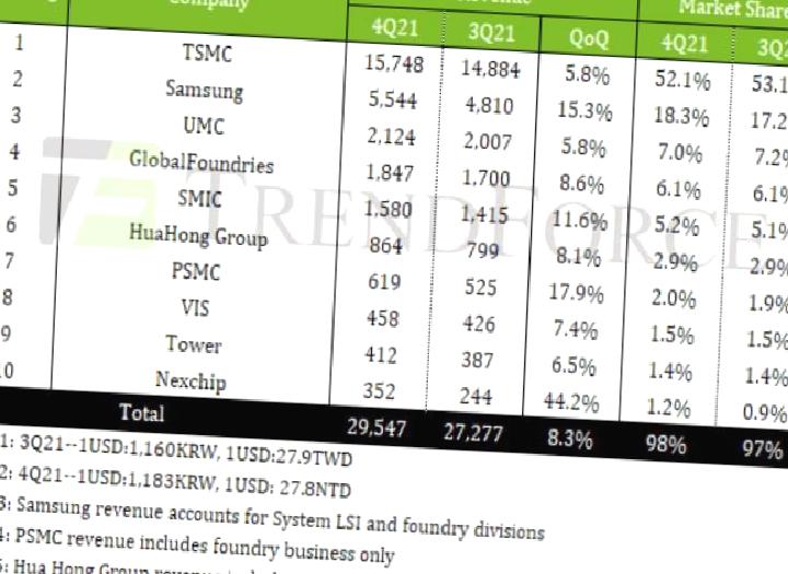 Dördüncü çeyrekte TSMC toplamda 15.7 milyar dolar gelir elde ederken pazar hissesi yüzde 52.1 düzeyine gerilemiş. Aşırı yoğunluk ve kıtlık nedeniyle firma ortalama fiyatlara zam yapmıştı. Bilhassa 5nm bantlarının gelire önemli katkı yaptığı ifade ediliyor. 6n/7nm bantları ise biraz düşüş göstermiş. Ayrıyeten taleplere de yetişemiyordu. Bu da pazar hissesini biraz etkilemiş gibi.