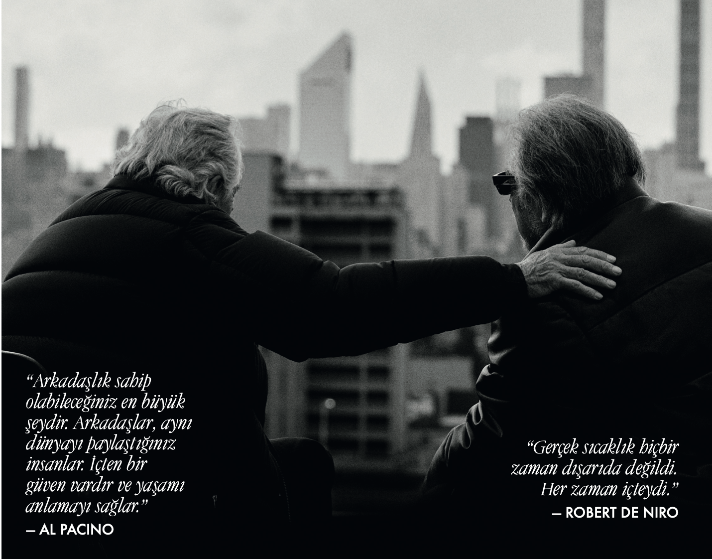 Gelelim büyük heyecan yaratan bu özel çekimin perde arkasına: New York’ta dünyaca ünlü portre fotoğrafçısı Platon tarafından çekilen kampanya, Al Pacino ve Robert De Niro’nun hikayesini siyah-beyaz kareler ve beş temalı kısa filmlerle anlatıyor: arkadaşlık, saygı, bağ, güven, sıcaklık, arka plan görüntüleri ve şehrin silueti eşliğinde. Dostlukları gözle görülür biçimde somut bir şekilde bakana geçiyor. İkonik ikilinin birlikte oturup konuşurken görsellere yansıyan enerjisi birbirini tamamlıyor.